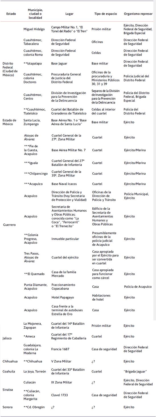 En el presente artículo fue posible avanzar en la localización de algunas en el Distrito Federal (DF) -hoy Ciudad de México-, Guerrero, Jalisco, Coahuila, Sonora y Sinaloa. Sin embargo, según el caso, se difiere en calidad y cantidad de información. El cotejo de fuentes realizado permite reafirmar su existencia en locales militares y policiales, como en espacios civiles. Por lo general, estos eran inmuebles particulares apropiados por distintas fuerzas de seguridad, incluso habitaciones de hotel, pero no en todos los casos se identificó el origen. La tabla 1 condensa los datos ubicados hasta el momento.