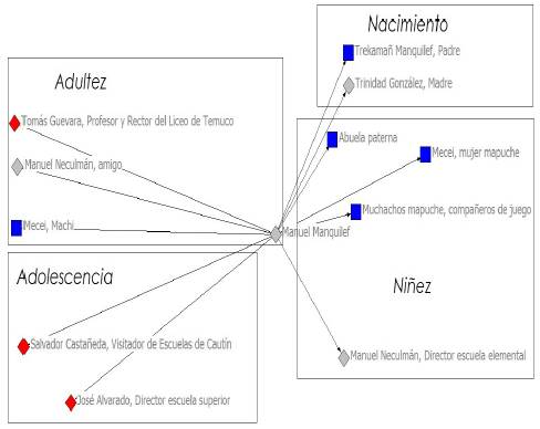 Un buen ejemplo de esta construcción de sujeto lo constituye el propio Manquilef. La figura 2 nos presenta la red egocentrada construida con los datos proporcionados por la autobiografía que él escribió en 1910 cuando tenía 23 años. Una red egocentrada es aquella que se construye a partir de un solo actor o ego junto con los actores a los que está conectados -alters- y los vínculos entre esos alters (Everett y Borgatti 2005, 31). Asimismo, supone "que el individuo puede manipular en cierta medida su red social para sus propios fines" (Requena 2003, 7). Para el caso estudiado se siguió un enfoque nominalista, esto es, los límites de la red fueron fijados por el investigador (Verd y Martí 1999, 513). Los datos fueron obtenidos a través de un análisis de contenido manifiesto de las fuentes consultadas. Es decir, se remitió a la información explícita proporcionada por estas (Báez y Pérez de Tudela 2009, 290). Concretamente, se consideraron aquellas personas que aparecen nombradas por el propio Manquilef en su ya mencionada reseña autobiográfica.