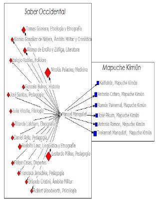 El tamaño de los nodos está en relación con su mayor o menor importancia en la fundamentación de las ideas de la obra. Un pedagogo y un médico son los más citados por Manquilef. No solo esto, los referentes y las referencias que sostienen los argumentos de Manquilef desde el Mapuche Kimün son notablemente menores. Lo anterior, es corroborado, además, por las palabras introducidas por el lingüista y etnógrafo Rodolfo Lenz en la obra, cuando declara que "para apreciar debidamente las esposiciones del señor Manquilef, no se debe olvidar que él es profesor de jimnasia i tiene la preparacion científica de la Escuela Normal" (Manquilef 1914, 2). El marco descrito cuadra bastante bien con lo que Foucault (2012, 18) ha denominado la inserción de un discurso de pretensión científica dentro de un sistema institucional. Luego, cabe preguntarse si esta voluntad que muestra Manquilef, no se confunde también con la trayectoria que parece haber seguido la ciencia -o una parte de ella- a lo largo de la historia. Esto es, el camino de una voluntad de verdad, que funciona como pivote de una voluntad de dominación. La estructura social proyectada por la red de la figura 3 permitiría afirmar aquello.
