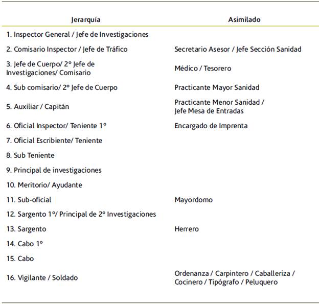 Estas reformas se sustentaron en un diagnóstico de crisis policial (Barreneche 2019) a partir del cual se incorporaron cambios para mejorar el accionar de los agentes y las condiciones materiales en las que tenían lugar su labores. De esta manera, bajo la jefatura de José Tristán Paz Casas (1936-1938) se sancionó el Reglamento de la Policía de Córdoba de 1936, que contemplaba la siguiente estructura burocrática y jerárquica (ver tabla 1).