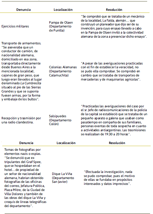 En el interior de la provincia, en algunas instituciones educativas se exoneraron de sus cargos a docentes y directivos que habrían manifestado su adhesión y apoyo a los totalitarismos europeos.37 No obstante, muchas denuncias realizadas por vecinos sobre presuntos "elementos nazis" en determinadas localidades cordobesas, no pudieron comprobarse por falta de pruebas, como se señala a continuación (ver tabla 2).