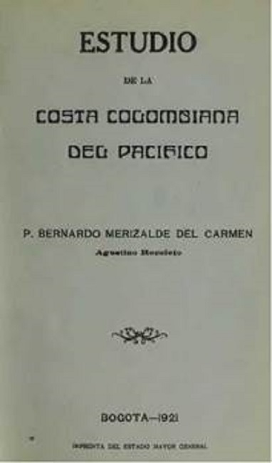 Como era costumbre en la orden, en 1921 Merizalde envió el manuscrito titulado Estudio de la costa colombiana del Pacífico a los frayes "censores" Rufino Pérez y Cándido Armentia, quienes le dieron el visto bueno en septiembre de ese año. El libro -publicado por la Imprenta del Estado Mayor General y que le mereció a Merizalde su ingreso a la Academia Nacional de Historia en 19228-, tenía 248 páginas, estaba dividido en 33 capítulos, un apéndice, bibliografía y una sección de "fe de erratas"; presentaba 27 fotograbados, un mapa de la costa del Pacífico y un plano topográfico de Tumaco (figura 3).