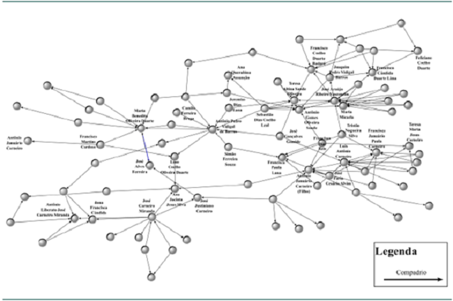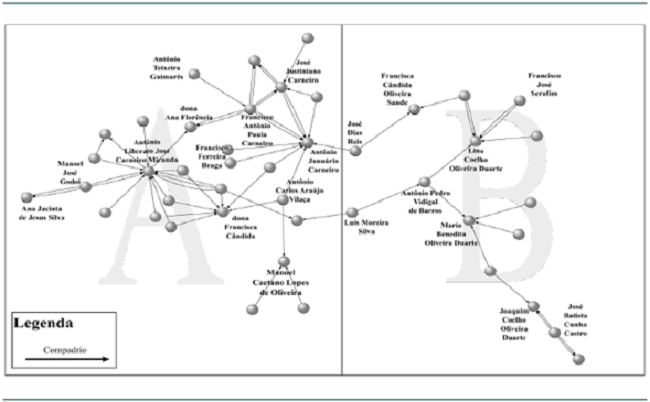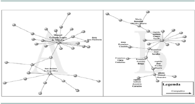 En este artículo se analizan las redes de compadrazgo no por pura casualidad de parentesco espiritual, sino, buscando detectar patrones y así reconstituir estrategias y entender las agencias de individuos y familias en el contexto político en cuestión. En lo que respecta a estas relaciones en la vida cotidiana colonial brasileña y específicamente en Minas Gerais, Venâncio, Sousa y Pereira, al examinar los diferentes vínculos de parentesco espiritual de cuatro importantes miembros de la elite política de Vila Rica en el siglo XVIII, encontraron una fuerte jerarquía social que se reproducía cuanto más alta era la posición administrativa del compadre, así como encontraron "redes de compadrazgo" que daban a la población liberta acceso indirecto al gobernador D. Luis da Cunha Meneses, la máxima autoridad de la capitanía de Minas Gerais en el período estudiado (Venâncio, Sousa y Pereira 2006).