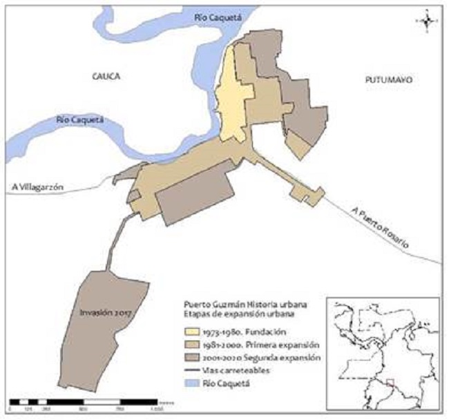 El segundo aspecto tiene que ver con la relación entre urbanización y bonanzas económicas, que en la Amazonia han estado muy ligadas a los auges extractivos (Arcila 2010), a su vez impulsados o facilitados por la apertura de carreteras (Uribe 2017). Estos auges han generado movimientos migratorios que, en casos como el de Guzmán, han sido decisivos en el surgimiento de centros urbanos. Por último, la alusión a los problemas de orden público sugiere un tercer aspecto persistente en la región como han sido los conflictos violentos. Estos han transformado la región de diversas maneras, incluyendo las dinámicas de urbanización. En el caso de Guzmán, como se describirá en la siguiente sección, aunque la violencia estuvo presente en sus primeros años, esta se manifestó con mayor fuerza desde la década de 1980 y jugó un papel relevante en las siguientes fases de urbanización.
