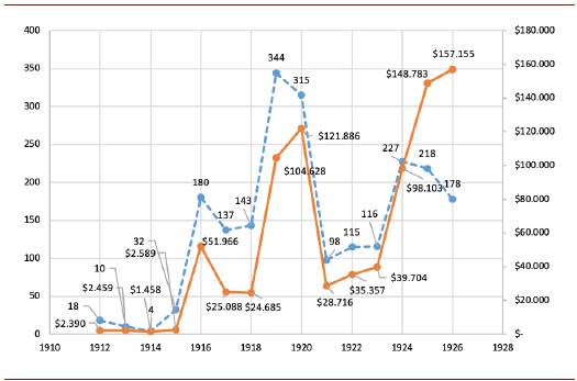 Entre 1921-1923 viene un período al que se llamó de desaceleración, durante ese lapso las compraventas pierden su impulso tanto en número de operaciones (pasan de 315 a 98) como en valor total (bajando de $121.886 oro a $28.716 oro). Esto, debido a que mucha tierra ya había sido transferida en el anterior ciclo y los nuevos propietarios durante un tiempo consolidaban los títulos, trabajaban y mejoraban la tierra obtenida; existió también el interés de esperar a que se valorizaran las tierras o que hubiera necesidad de producir más café, es decir, estaban esperando el momento oportuno para vender. El último momento está entre 1924-1926 -fase llamada de valorización de la tierra-, cuando las operaciones no aumentaron demasiado, pero si fue posible que se llegara a los valores más altos experimentados durante todo el análisis, tierra que estuvo valorizada con operaciones desde los $10 oro hasta los $10.000 oro como aparece en la figura 2 a continuación:
