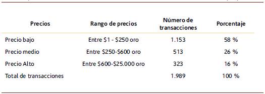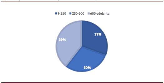 El crédito hipotecario sobre tierras se caracteriza porque se hacía sobre propiedades legalizadas, por los préstamos con plazos entre seis meses y un año, también porque las operaciones se legalizaban mediante contratos por hipoteca, asimismo porque la presencia de estas operaciones dinamizó el mercado inmobiliario, que se compuso de propiedades pequeñas y medianas, y porque adquirió relevancia en la vida civil de los poblados (Cuéllar 2004; Ramírez y Londoño 2013). Una dinámica similar sucedió para el caso de Sevilla, en cuyas 263 operaciones encontradas de este tipo de crédito, encontramos que muchas de las transferencias que se hicieron fueron respaldadas con crédito a largo plazo; como se puede ver en la figura 3 fueron muy equilibradas entre los actores pequeños ($1-$250), medianos ($250600), y grandes (mayor a $600).
