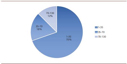 Los datos entregados reflejan que el 58 % del total de las operaciones de dominios trasferidos en el área rural de Sevilla estuvieron dentro del categoría de los precios bajos, seguido por las del nivel medio con un 26 % y un número menor representativo en las trasferencias más altas; las cuales estaban dotadas de importante extensiones de tierra, explotación agrícola, y adaptación de tecnología, fue sobre estas aristas que hubo una regulación del valor de cada dominio trasferido en este entorno geográfico. Ahora tomando los mismos datos y realizando un gráfico de distribución estadístico máximo, permite analizar los rangos de las operaciones realizadas, para conocer en donde estuvo la mayor parte del área trasferida, para lograrlo discriminamos los datos en tres rangos: el primero que va de 1 fanegada hasta 35, el segundo 35-70 y finalmente 70-130 como se reflejará en la figura 5.
