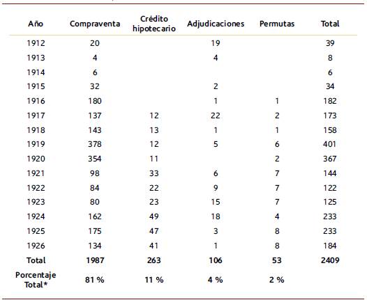 De esta manera, el desarrollo del mercado de tierras para el caso del municipio de Sevilla, durante el período 1912-1926, fue bastante variado, monetizado, flexible, dotado de crédito y dinámico, con 2409 transacciones -analizadas en este periodo-. En este mercado a nivel general se pueden obtener tres puntos básicos de interés: el primero es su existencia a partir de un proceso de colonización, explotación y legalización de la propiedad del suelo; segundo, se tiene la presencia del cultivo del café y un interés constante por cultivarlo, como una demanda alta de este commodity a nivel local, regional e internacional; y en tercer lugar, los actores inmersos en la dinámica del mercado son de diversa procedencia y diferente poder adquisitivo. Están en función de moverse en el mercado -sea comprando o vendiendo-, siempre en procura de obtener una propiedad para aquellos que no la tenían, ensanchar y mejorar la propiedad para los que la tuvieran, o lograr ganancias al hacer operaciones de compra, de venta o préstamos de dinero sobre hipoteca.