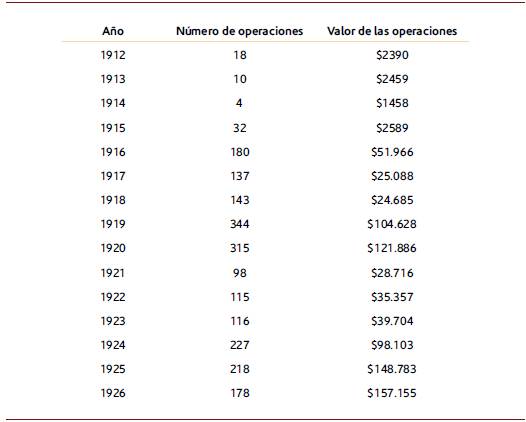 Las operaciones de compraventa ocuparon el primer lugar dentro del mercado de tierras de Sevilla, con un total de 1987 operaciones. Estos casos fueron rastreados en la Notaría Única de Zarzal, y se sabe que se efectuaron de 1912 a 1915; y en la Notaría Primera de Sevilla desde 1915 hasta 1926.6 Las dinámicas de compraventa confluyeron en establecimiento de un importante mercado de tierra, que progresivamente fue aumentado su oferta y demanda lo cual generó capital líquido en el financiamiento de las inversiones en ámbito local. Si nos remitimos a las transferencias de compraventa dadas entre 1912 y 1926 suma un total de 838.660 pesos oro; el crecimiento en las ventas como el valor no fue gradual ni permanente, esta fue dependiente con la valorización de los predios y el número de las operaciones registrada por dominios.