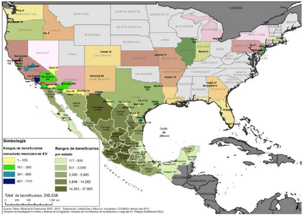 Asi pues, bajo la presión de organizaciones de braceros el gobierno federal y las instituciones del Estado terminaron por poner atención al problema de los ex braceros. Primero se decidió la instalación de una comisión parlamentaria especial para dar seguimiento a los fondos aportados por trabajadores mexicanos braceros. Esta integró a representantes de los principales institutos políticos representados en la Cámara de Diputados. En 2003, se llevó a cabo una reunión entre los miembros de esa comisión y representantes de la SEGOB, de la Secretaria de Relaciones Exteriores (SEE), Banco de Crédito Rural (Banrural) y organizaciones de braceros. Acordaron levantar un padrón de los braceros que laboraron entre 1942 y 1946, brindar asistencia médica a los braceros y sus cónyuges, y fincar las bases para la creación de un programa de atención especial. El 25 de mayo de 2005 se aprobó la ley para crear el Fideicomiso que Administra el Fondo de Apoyo social para extrabajadores Migratorios Mexicanos. En noviembre de ese ano, se publicaron las reglas de operación del programa y se planteó el levantamiento de otro padrón de braceros en mesas receptoras en cada estado de la federación con el objetivo de integrar a todos los braceros que habian participado en el programa. El gobierno de Felipe Calderón continuó con la implementación de este programa de apoyo social. Tras una serie de vicisitudes sobre el pago a los braceros -en una sola exhibición de 38 000 pesos o con anualidades de 4000 pesos- y vericuetos legales,11 el programa indemnizó en 2012 a 222 521 braceros o derechohabientes, con poco más de 7500 millones de pesos (figura 1).107