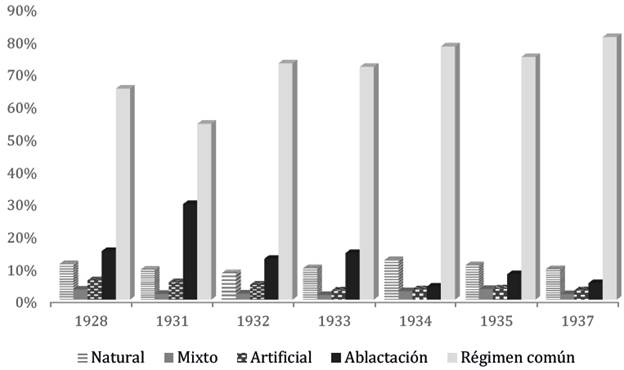 Gracias a los informes del médico de la sección del campo y a la vigilancia de niños y nodrizas, es posible conocer la clasificación de los hospicianos según su régimen alimenticio para el periodo comprendido entre 1928 y 1937 (figura 2).