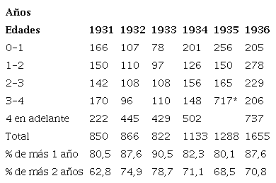 Por sí mismas, estas cifras no dan cuenta de las condiciones de alimentación de los niños, pues al analizar los rangos de edades de los infantes que hacían parte de la sección del Campo nos encontramos con que, entre 1931 y 1936, al menos el 60 % eran mayores de 2 años; es decir, ya no estaban en periodo de lactancia (tabla 1). Sin embargo, estas cifras son indicativas al menos de los esfuerzos por llevar a cabo rutinas estadísticas de las condiciones de alimentación de los hospicianos. Con todo, es notorio que esas rutinas no llevaron a análisis proyectados en el tiempo y tal parece que tuvieron una finalidad meramente administrativa.