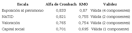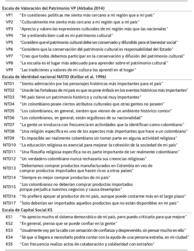 Para este estudio se analizaron y seleccionaron tres escalas psicométricas correspondientes a cada indicador: Valoración del patrimonio (Akbaba 2014); Identidad nacional NATID (Keillor et al. 1996); y Capital social -diseñada en este estudio-, ya validadas en estudios anteriores. Y se contrastaron con el indicador "valoración del patrimonio". Exposición al patrimonio cultural. Se aplicó el instrumento estudio sobre organizaciones de patrimonio cultural y consumo cultural, partiendo del supuesto teórico que un nivel más alto exposición al patrimonio daría como resultado un valor más elevado en la escala NATID, la valoración y un mayor nivel de capital social. Las escalas psicométricas son intentos de medir aspectos de la emocionalidad humana y han sido usadas con éxito en distintos campos de la salud mental -Burnout, estrés, psicopatía, etcétera-. A continuación, se explica en qué consiste cada una de las escalas.