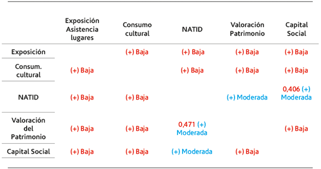 Este estudio puso a prueba cuatro indicadores, tratando de contrastar la relación entre la Exposición al patrimonio cultural y las escalas psicométricas (i) Valoración del patrimonio VP, (ii) Identidad NATID y (iii) capital social KS. A pesar de los esfuerzos en la medición, las correlaciones son bajas o moderadas, lo que indica que el fenómeno del patrimonio cultural es mucho más complejo que ir a museos o visitar bienes de patrimonio y, probablemente, depende de otros factores, no solo la exposición al patrimonio, la visita a lugares de interés o la participación en actividades culturales a diferencia de lo que propone la teoría (García 1998; Prats 1997).