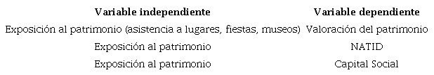 Para intentar responder a ello en este artículo se evaluó la correlación de tres indicadores muy frecuentes en la literatura sobre patrimonio cultural: valoración del patrimonio, identidad nacional y capital social, con la exposición al patrimonio o la cantidad de veces que se han visitado lugares tradicionales de patrimonio. A continuación, se presentan cada uno de los indicadores, los cuales han sido evaluados y validados en diferentes contextos y la metodología de análisis.