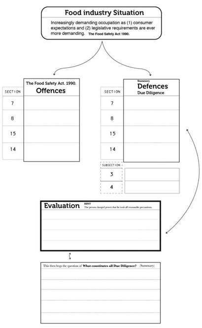 Furthermore, within the Offence-Defence pattern there is a recognizable arrangement in the chapter structure where there are three fundamental features: an introduction contextualizing a behaviour in regards to dynamic determined circumstances―e.g., The Food Safety Act 1990 shows the food industry as a demanding one because of high consumer expectation and legislative requirements―, followed by some offences which define the breaking of the law―e.g., Section 8, selling food that does not comply with the food safety requirements―and defence as the process of denying a charge―e.g. Section 21introduces the due diligence defence: a defence in English law, whereby a defendant can be found not guilty if it can be shown that "all due diligence had been exercised, and all reasonable precautions taken to ensure the offence would not occur".