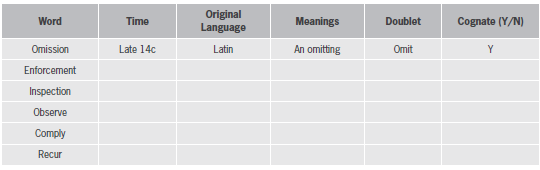 Note: you may use an online dictionary such as: Word Reference, The Free Dictionary or Merriam-Webster. 5. Etymology: Fill-in the following chart using an etymological dictionary, such as etymonline.com: