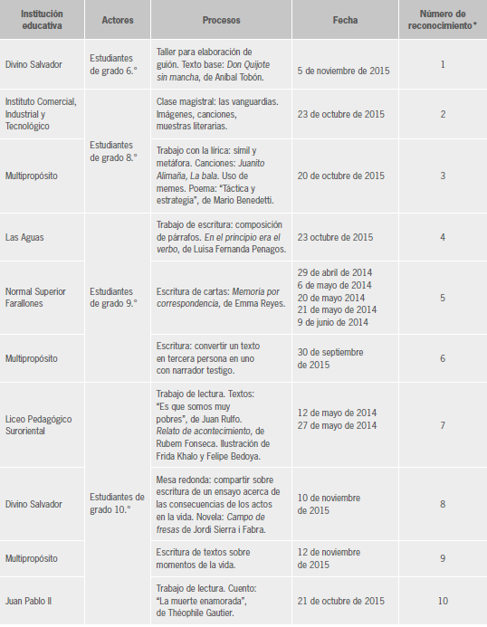 De esta manera se comprueba que un número significativo de practicantes utilizó los textos abordados como modelo para producciones escritas de sus estudiantes; en tal sentido, la categoría en su versión completa se denominaría: Lectura de textos con fines de escritura. Ya sea para escribir una carta -donde se usó como modelo el libro de Emma Reyes Memoria por correspondencia-, para elaborar un guión -a partir de la lectura juvenil de Don Quijote sin mancha, de Aníbal Tobón-, redactar textos sobre un momento especial de la vida de los estudiantes -teniendo como punto de partida el relato de literatura juvenil Campos de fresas, de Jordi Sierra i Fabra-, las lecturas tuvieron una funcionalidad en las producciones textuales.