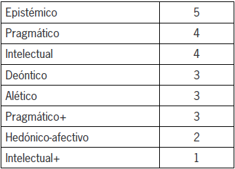 En lo que se refiere a los valores activados en los elementos del núcleo de significado de tarea escolar, en primer lugar, se encuentran los valores asociados a la zona modal axiológica (pragmáticos, intelectuales y hedónico-afectivos), luego, se hacen presentes los ontológicos (aléticos y deónticos), y por último, se ubican los pertenecientes a los de juicio de verdad (epistémicos), como se puede apreciar en la tabla 2.