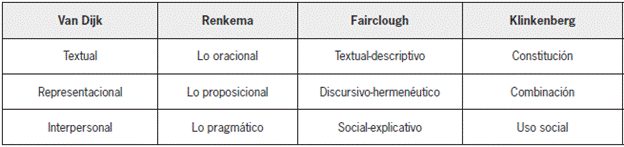 De esta suerte, si comparamos los modelos de Van Dijk, Renkema y Fairclough, por parte de los representantes del AD, la postura metódica propuesta por Klinkenberg, desde la semiótica teórica, encontramos las similitudes descritas en la tabla 2.