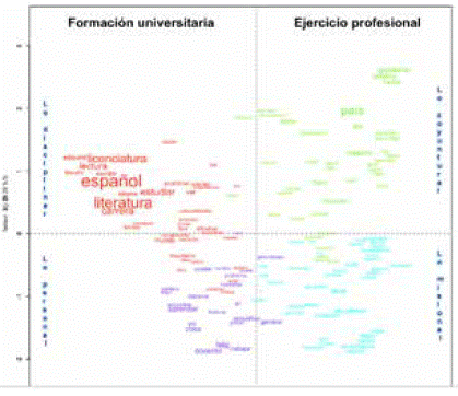 En sus textos, los estudiantes se posicionan frente a la dimensión política de la labor docente desde el lugar de los espectadores, tras la barrera de la formación universitaria construida como saberes disciplinares y trayectorias de vida personal. La configuración de estos mundos lexicales puede leerse en clave de un cierto privilegio de las motivaciones individuales sobre las colectivas, cuando se interroga acerca de la elección de ser docente de lengua materna: la construcción de los significados de lo social presenta mayor dispersión que lo asociado con la formación universitaria. Esa mayor o menor cohesión entre los significados puede visualizarse en un gráfico de dispersión a partir del análisis factorial de correspondencias (AFC) (figura 2):