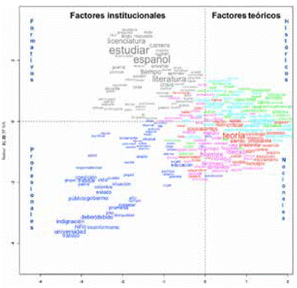El predominio porcentual de los factores teóricos sobre los institucionales (68,7 % sobre 32,3 %) puede leerse como un síntoma de la dificultad para integrar los saberes movilizados en clase con los saberes sociales de referencia. No obstante, este mayor índice también está influido por los requisitos del género textual (parcial o examen final) como género de formación académica (Natale y Stagnaro, 2014), en el cual la demanda de explicitar los aspectos teóricos puede llegar a aislarlos de su uso aplicado e interpretativo sobre la realidad, como el profesor lo esperaría. En cuanto a la distribución espacial de las correspondencias, la tendencia de los factores teóricos es al aglutinamiento o mayor cohesión entre los significados, en contraste con una dispersión más evidente en los factores institucionales y especialmente en los profesionales (figura 4).