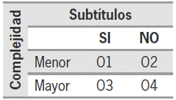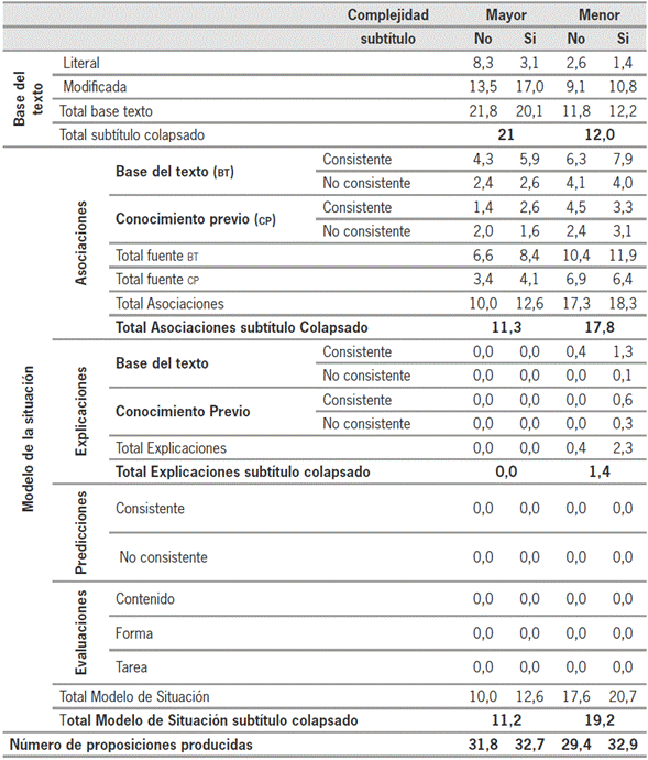 Para dar cuenta de los resultados, en primer lugar se presentan los relativos a la generación de proposiciones según las variables complejidad (mayor y menor) y subtítulo (sin subtítulos y con subtítulos); enseguida se desarrollan los correspondientes al contraste entre las proposiciones según los niveles base del texto (BT) y modelo de situación (MDS); finalmente, se exponen los específicos para cada nivel de acuerdo con las categorías específicas (BT: literal/ transformada; MDS: tipo de inferencia [asociación/ explicación/predicción] y origen de la información [BT / conocimientos previos]). Los resultados de las categorías con valor cero (0,0) no se tienen en cuenta en los resultados por no tener ocurrencias.