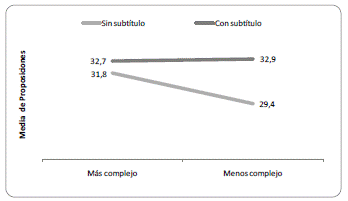 La media de proposiciones de los estudiantes que leyeron el texto más complejo fue de 32,4 (figura 2), en tanto que la de los que leyeron el menos complejo fue de (31,2), sin que el factor número de proposiciones se presente como estadísticamente significativo (F=0,66 p< 0,05). En tanto la variable subtítulo no presenta efecto significativo, en los siguientes apartados se da cuenta de los resultados según la variable complejidad.