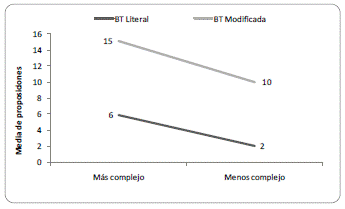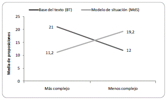 En tanto en el texto más complejo la media de proposiciones en BT es mayor que en MDS; en el menos complejo, las diferencias se presentan a favor de las proposiciones del nivel MDS sobre las correspondientes a BT.