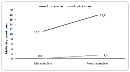 La figura 5 presenta la media de inferencias asociativas y explicativas producidas en los dos textos. En los dos casos es mayor la media de asociativas que de explicativas. Estas diferencias son estadísticamente significativas (asociativas, F= 5,3 p < 0,05; explicativas, F= 8,1 p < 0,05;). Del mismo modo, en el texto menos complejo las inferencias asociativas como las explicativas fueron más numerosas que en el texto más complejo.