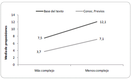En consecuencia, el número de proposiciones generadas para cada texto (más complejo vs menos complejo) no presentó diferencias, ni tampoco la presencia o ausencia de subtítulos en los mismos durante su lectura.