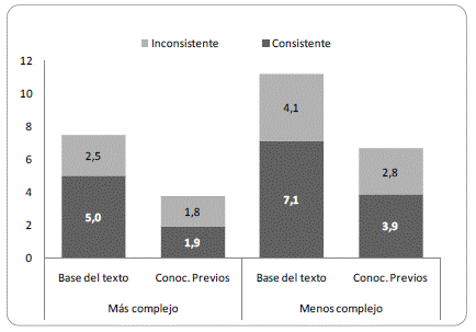 Si bien las diferencias en cuanto a la consistencia en los significados de las inferencias no son estadísticamente significativas, se presentan los resultados específicos en cada texto (figura 7).