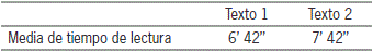 Para garantizar que los textos seleccionados fueran efectivamente diferentes en tema y grado de complejidad, se realizaron pruebas piloto con un grupo de estudiantes de características semejantes a los participantes de la prueba, quienes leyeron los textos y respondieron a la tarea de escritura. En el pilotaje se estableció la media de tiempo de lectura para cada texto. La tabla 1 presenta los datos de la media de tiempo.