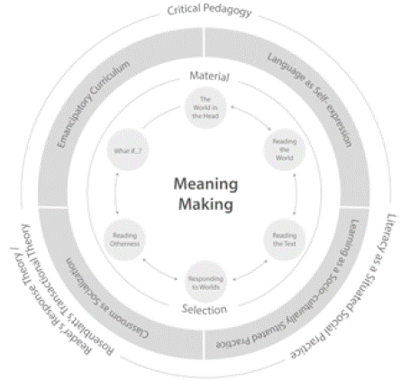 The pedagogical experience implemented as an after-school program generated changes in the way that participants approached literacy. The different short stories, moments, and activities of the Book Club contributed significantly to build up a critical perspective where responding to, transacting with, and living-through the literary text gave meaning to the act of reading. Figure 1 shows a visual representation of the way the different elements of the Book Club articulated. First, three key constructs provide the theoretical background that frames the proposal. These include a critical perspective on pedagogy, an understanding of literacy as a situated social practice, and the transactional and reader's response theories proposed by Rosenblatt (1994, 2002, 2013). Second, the views of curriculum, language, learning, and classroom provide the framework to build up a system of beliefs about the main components of the teaching practice. With these in mind, a careful process of material selection takes place and a series of moments to develop the reading club are put forward having meaning-making at the core of the reading practice.