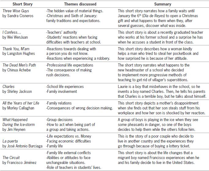 The literary works chosen for the development of the Book Club were socially situated, that is, they were in line with students' interests such as dealing with situations at home and school, a major characteristic to have in mind in material selection (Lazar, 1993). Similarly, Collie and Slater (1991) state that one primary factor in selecting the literary text is the kind of personal involvement, interests, and reactions the text may arise in the reader. All the short stories used during the Book Club were close to students' current realities. When a text involves insights into family, school, or daily life-related issues which are close to the heart of peoples' concerns, the reader feels delighted of finding thoughts or situations as a part of her/his own life, the same delight of encountering those same thoughts or situations seen from a totally new, unexpected perspective (Collie and Slater, 1991).