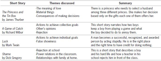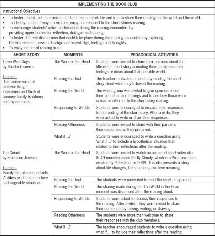 Thus, since the purpose of this pedagogical experience was to create a space where students shared their reading responses by problematizing reality through dialogue (Freire and Macedo, 1987), all the activities were developed taking into account the students' interests as the core of the Book Club thus promoting response, reflection, and sharing. Then, planning of the actions articulated with the reading moments explained above and had in mind specific instructional objectives framed within a critical literacy approach. Table 2 presents a sample of the pedagogical activities developed around three of the selected short stories. It includes the instructional objectives, the main themes of each short story, and a description of the pedagogical activities developed in each one of the reading moments.
