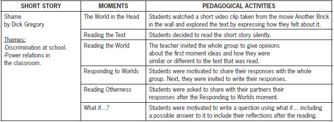 From a critical perspective, the use of short stories in the classroom may motivate the love for reading. Also, it may encourage linguistic, social, personal, moral, and emotional experiences (Mubarak, 2013). Hence, this pedagogical proposal emerged as an opportunity to promote reading framed within a critical literacy approach that engaged a group of high school students in reading practices. These practices focused on the experience of reading the text and the world (Freire and Macedo, 1987), on students' responses to reading (Rosenblatt, 2002), and how those reading responses could be useful for participants to achieve individual and social purposes, that is, literacy understood as a situated social practice (Baynham, 1995).