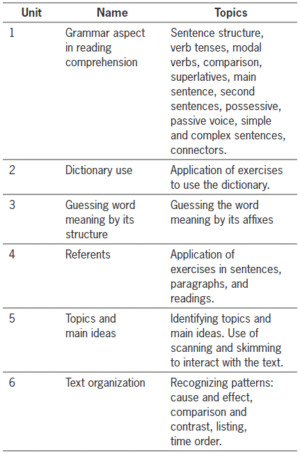 The objective of the course was to prepare students in the use of reading strategies for general reading. The course lasted 80 hours and students attended it twice a week, two hours each class session. The course comprehended six units as table 1 shows.