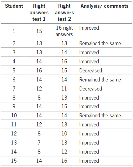 Although the first and second tests were different, they kept the same structure and level of difficulty. Both trials had two paragraphs and 18 questions each. Table 2 presents the results of all students: