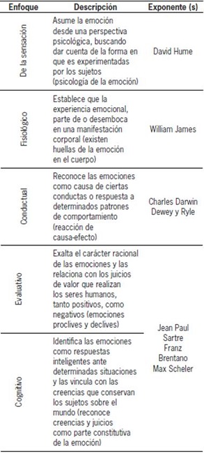 Los primeros autores en preguntarse ¿Qué es una emoción? Fueron Cheshire Calhoun y Robert Solomon, finalizada la década de los noventa. En su obra, la cual conserva este mismo nombre, los docentes refieren la pregunta por la sensibilidad humana, desde la Grecia Antigua, hasta nuestros días, manifestando de manera expresa que, si bien, el estudio de este campo de conocimiento no es propio de ninguna disciplina, su abordaje y desarrollo ha estado situado de manera especial en la psicología, el psicoanálisis y la filosofía (1996). Dicha trayectoria permite a los teóricos reconocer cinco enfoques desde los cuales han sido analizadas las emociones: