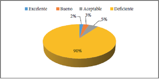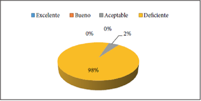 El 98 % de los estudiantes muestra un nivel Deficiente y un 2 %, Aceptable. Esto indica que como se les dificulta descubrir contenidos implícitos, no logran reflexionar y valorar con el apoyo en los entornos socioculturales propios y los irradiados en el texto, es decir, leer tras las líneas.Cassany (2013) afirma que para lograr una lectura crítica se requiere desentrañar la significación del lector a partir de la relación recíproca que establece con sus esquemas de conocimiento. En síntesis, las cifras demuestran que los estudiantes se desempeñan bien en el Reconocimiento de la información explícita, en la lectura meramente literal, pero no así en el Desentrañamiento de información implícita ni en procesos reflexivos, evaluativos y críticos.