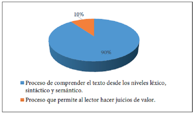 El 90 % de los maestros concibe la lectura crítica como proceso de comprensión a partir del léxico, la sintaxis y la semántica; es decir, se apoyan en la dimensión lingüística y descuidan la psicolingüística y la sociocultural. El 10 % la entiende solo como un ejercicio evaluativo del lector.