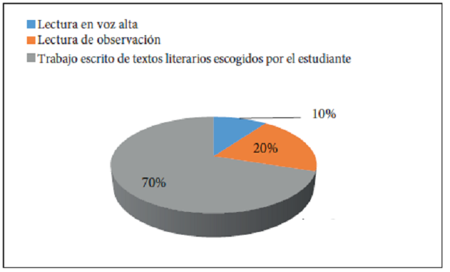 El 10 % de los docentes fomenta la lectura en voz alta; esta respuesta es incompleta, no especifica la forma como el lector construye el sentido ni qué hace con él. El 20 % pide a los estudiantes observar el texto (títulos, subtítulos, imágenes, etc.) y decir de qué se trata; no queda claro si se lee el contenido del texto o no. El 70 % les solicita elegir y leer una obra literaria para presentar un resumen escrito; esta información indica que no hay acompañamiento de ese proceso lector. Así pues, son evidentes sus limitaciones en la implementación de estrategias didácticas para trabajar la lectura. Véase el análisis de respuestas a la pregunta 3 en la figura 6.
