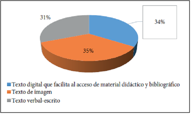 El 35 % de los docentes define el texto multimodal como el que incluye la imagen. Aducen que esta reemplaza a la palabra como articuladora de significados y por ello es necesario usarla para incentivar la lectura. El 34 % lo reconoce como texto digital que facilita "el acceso didáctico de material bibliográfico", y el 31 % manifiesta que es un "texto verbal escrito". De estos datos se colige que no hay un conocimiento claro sobre la naturaleza y la relevancia de su empleo para dinamizar la lectura crítica. Para Kress (2010), los textos multimodales incluyen recursos semióticos que se usan actualmente en la producción de sentido, como la escritura, la imagen, el sonido y los gestos, y Vargas (2015) cita a Cassany (2004) para enfatizar en que el discurso no solo contiene letras, también fotografías, imágenes, videos, audios, reproducción virtual, etc. Entonces, su empleo en el aula constituye un recurso atractivo para formar lectores críticos.