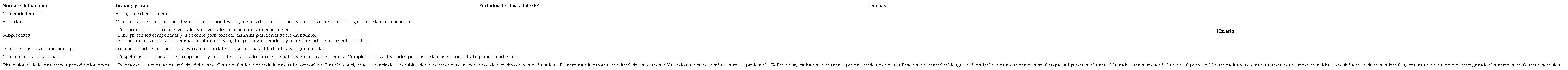La tabla 1 registra aspectos informativos, a saber: nombre del docente; grado y grupo; períodos de clase para los cuales está programado el plan; fechas; horario; contenido temático; estándares de lenguaje; subprocesos; derechos básicos de aprendizaje; competencias ciudadanas;5 enunciación sintetizada de las tres dimensiones de lectura crítica del texto elegido que se abordarán de modo articulado al contenido temático de la clase; y descripción de la actividad de producción textual derivada de la lectura crítica, especificando el tipo de texto que crearán los estudiantes.6