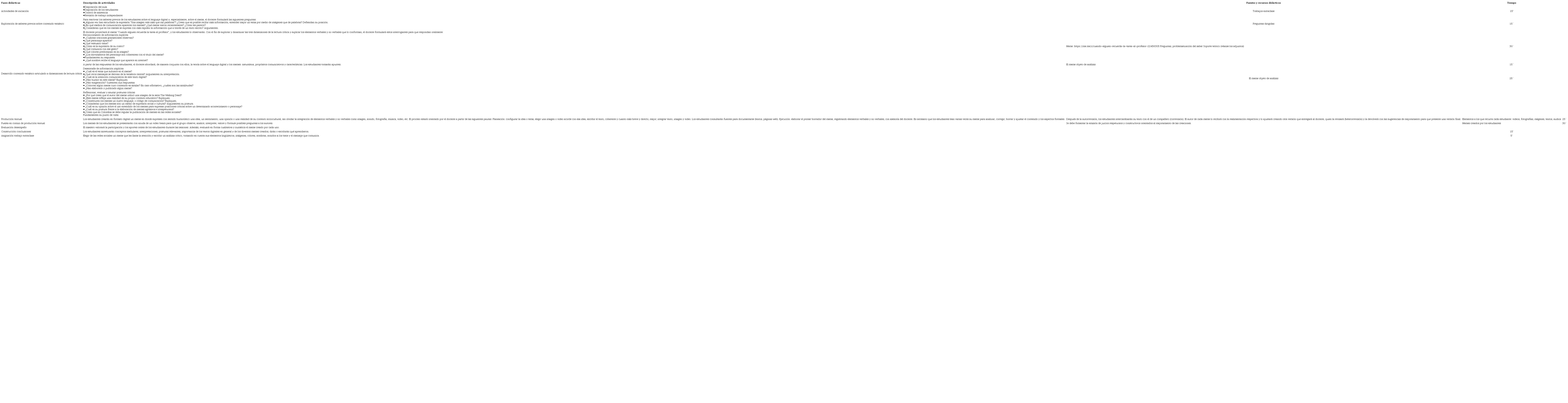 La tabla 2 muestra el desarrollo de la clase, allí aparecen cuatro columnas: fases didácticas, descripción de actividades, fuentes y recursos didácticos, y el tiempo de duración. Véanse las fases: