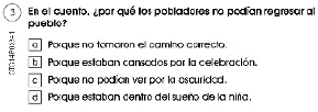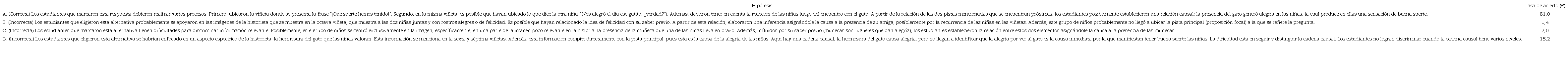 Cabe resaltar que la tarea requiere de la integración de información, debido a que en el texto se omite el uso de conectores causales. Por ello, era indispensable relacionar dichas pistas o marcas textuales para generar la inferencia. La medida del ítem en la escala Rasch es de -1,8, lo que significa que esta inferencia resultó fácil para los estudiantes evaluados.
