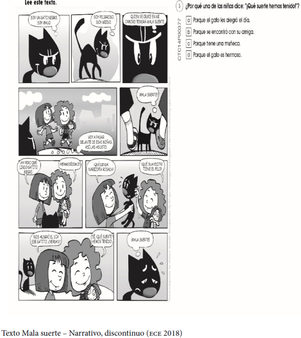 La Oficina de Medición de la Calidad de los Aprendizajes, responsable de las evaluaciones de logros de aprendizajes del sistema educativo peruano, elaboró una prueba de lápiz y papel para medir el desempeño de los estudiantes en la competencia lectora según los estándares establecidos en el Currículo Nacional de Educación Básica (Minedu, 2017). Dicha prueba, en cada evaluación ECE o EM, se conformó de 4 textos y 26 ítems el primer día, y otra cantidad similar el segundo día de la evaluación. Del total de textos evaluados en la ECE y EM, se seleccionaron solo los textos narrativos utilizados en la evaluación y aquellos ítems que evaluaron la inferencia de relaciones causales. En total, se seleccionaron 9 textos narrativos, 3 discontinuos (historietas) y 6 continuos (cuentos), y un total de 12 ítems de opción múltiple de relación causal (48 respuestas: 36 distractores y 12 respuestas correctas). Estos constituyen finalmente el corpus de análisis. Al tratarse de una evaluación de logros de aprendizaje, la complejidad de los textos guarda relación con los documentos curriculares vigentes. Estos describen los textos a partir de dos aspectos: la estructura y el vocabulario. Los textos empleados en las pruebas tienen una estructura simple con algunos elementos complejos. Se trata de textos en los que predomina una secuencia textual. El vocabulario predominante en estos textos es de uso frecuente, aunque pueden emplearse palabras especializadas vinculadas a áreas de temática escolar. En términos generales, la extensión de los textos oscila entre una y dos páginas, y un aproximado de 500 palabras.