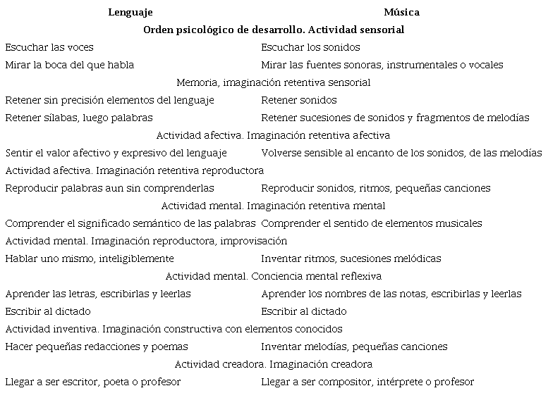 Así, de la lengua materna a la música solo hay un paso ya que, en ambos casos, nos hallamos en el mundo de los sonidos y, a partir de este principio, tanto Willems como Suzuki fijan un orden de desarrollo similar entre la capacidad lingüística y la capacidad musical (Bossuat, 2007).