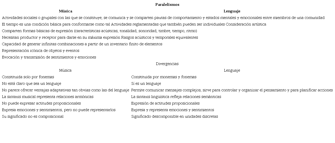 En este mismo sentido, Alonso, Suárez, Espinoza y Ramírez (2016) proponen una serie de aspectos asimilables entre música y lenguaje, de los que destacan los siguientes:
